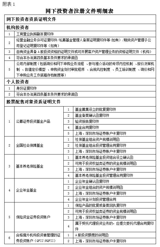 十二、删除原附表1。附表2改为附表1, 网下投资者资质证明文件表中,机构投资者增加“期货资产管理子公司登记证明复印件等”;配售对象资质证明文件表中,配售对象类型增加“基本养老保险基金”,资质证明文件增加“最近一个月末托管人出具的资产估值1000万以上的报告”、“最近一个月末沪深证券账户资产1000万以上对账单”、“首次交易日期查询记录(中国登记结算公司)”等注册材料。