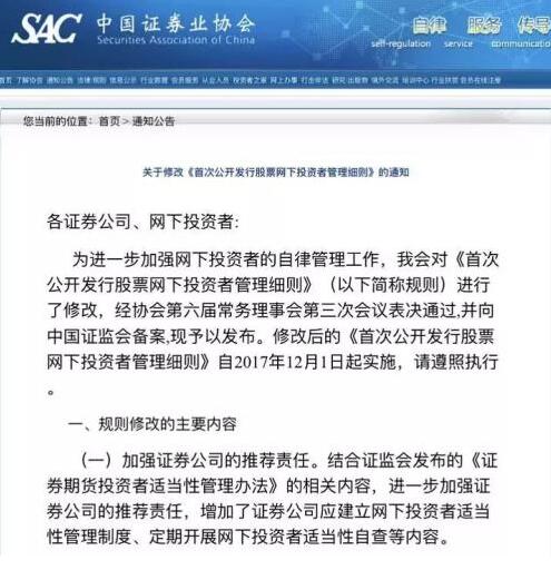 根据安排,修改后的《首次公开发行股票网下投资者管理细则》自2017年12月1日起实施,对于年内的首发项目,协会做了过渡期安排。