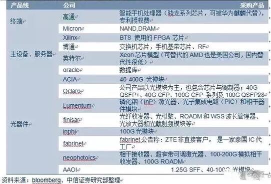 中兴上游的美国企业。受消息影响,截至4月16日美国股市收盘,高通下跌1.72%、美光下跌1.11%、博通上涨0.98%、英特尔上涨1.04%、Oracel上涨0.35%,由于中兴占以上巨头采购量较小,因此对其影响不大。同时,中兴采购量占自身出货量30%的ACIA暴跌35.97%、Oclaro下跌15.18%、Lumentum下跌9.06%、finisar下跌4.05%、inphi下跌4.05%、fabrinet下跌9.81%、AAOI下跌0.73%。