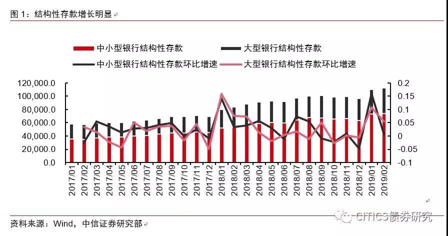 18年中资银行结构性存款规模增长明显,全年增速为38.4%,19年2月份结构性存款规模为11.2万亿。结构性存款规模的增长主要与流动性监管趋严有关。自央行《2017年第二季度中国货币政策执行报告》中表示将同业存单纳入MPA同业负债考核,限制银行负债端的资金融入之后,银行对结构性存款的依赖度提高,结构性存款规模持续上升。且2017年以来,在银信监管新规、银行委托贷款监管新规、资管新规等监管大潮席卷之下,部分表外融资的需求回归表内,银行亟需发行结构性存款补充负债端资金,提升流动性。此外,结构性存款增长也是由于承接了资管新规监管下原低风险偏好者对保本理财的需求,但监管口径上结构性存款与同业理财混同,较难解释统计数据的变化。18年下半年结构性存款规模增速出现一定程度的下滑,或是由于7月份颁布的理财新规要求发行结构性存款的银行需有衍生品交易资质,部分中小银行不满足要求。
