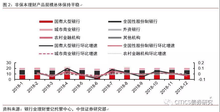 非保本理财产品规模总体保持平稳,18年末余额为22.04万亿元,与17年末基本持平,规模随监管松紧而略微变动。18年4月27日“资管新规”发布,要求理财产品净值化转型,不合规的理财产品按照每年1/3的进度,在2020年末之前整改完毕,但投资者对净值型的新产品接受能力不强,非保本理财产品在5、6月份规模锐减。考虑到实际整改的困难,18年7月20日央行发布理财新规征求意见稿,对监管要求略微放松,允许银行自主掌控压缩老产品的节奏,老产品可以投资新资产,现金管理类理财产品可以使用摊余成本法等等,使得非保本理财产品规模在8、9月份显著回升。