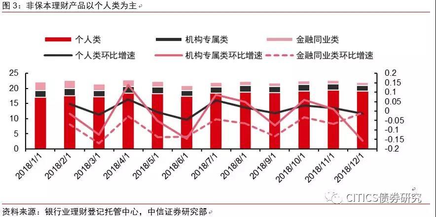 按照投资者类型分类,非保本理财产品以个人类(包括一般个人类、高净值资产类、私人银行类)为主,机构专属类理财产品与金融同业类理财产品规模较少。从存续余额看,个人类理财产品从2018年1月的16.99万亿增长到18年末的19.17万亿,增长率为12.8%,18年末的市场占比为87%;机构专属类理财产品从2.35万亿下降到1.78万亿,降幅24.3%,占比为8%;金融同业类理财产品从2.84万亿降至1.1万亿,降幅更大,达61%,占比为5%。