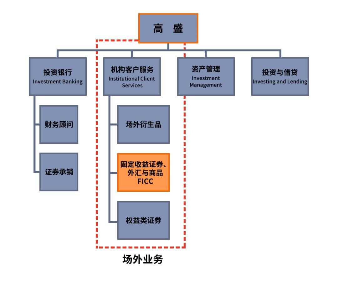 2010年开始,高盛重新梳理了业务类型,将场外业务作为服务机构客户的主要方式,发挥投行优势,优化服务,比如根据客户的风险敞口、投资目标以及其它需求,构造个性化产品,为客户提供投融资及交易服务。文稿中放有高盛业务结构图,您可以点击查看: