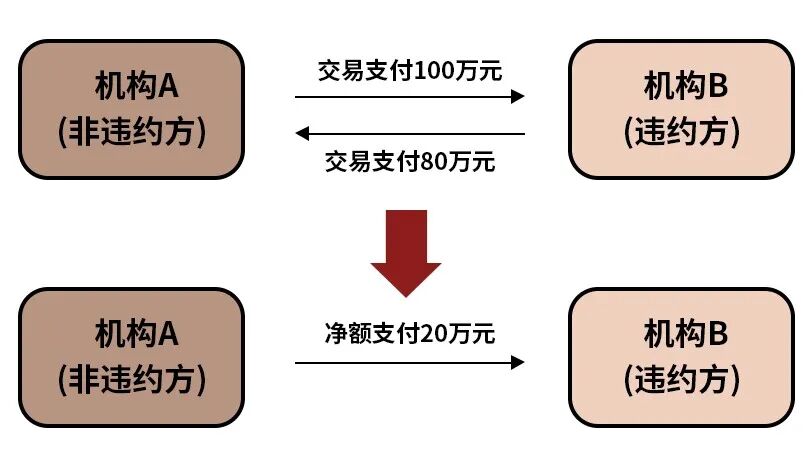 例如,假设机构A和机构B之间达成两笔互换交易。互换交易1结果为机构A需向机构B支付100万元,互换交易2结果为机构B需向机构A支付80万元,且机构B发生破产或违约事件。
