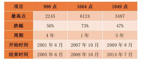 998点前的下跌,始于2001年6月15日的2245点,历时4年,经历了下跌-盘整-下跌,累计跌幅56%。1664点前的下跌始于2007年10月19日6124点,下跌为时1年,累计跌幅73%。1849点前的下跌始于2009年8月4日3487点,经历了盘整-下跌-盘整,历时近5年,一直到14年7月才逐步上涨最终进入下一轮牛市,累计下跌47%。