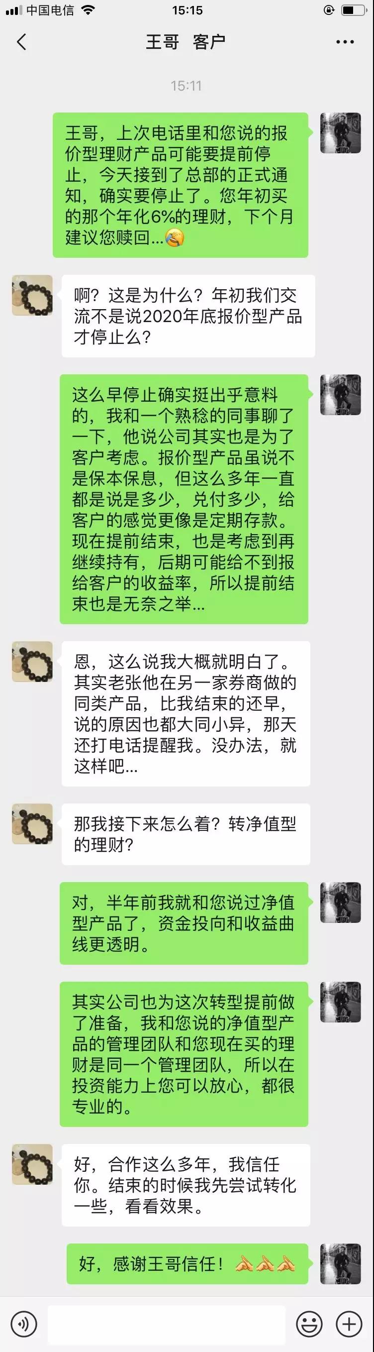 最近,小证从多家券商了解到,虽然资管新规留给报价型产品的截止期是2020年底,但是很多券商已经开始提前行动,停止报价型产品的发售和运行了,提前进入净值型产品的转化阶段。像这样的事情,过去和未来几个月内,可能已经或者将要发生在投资者身上。
