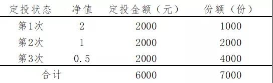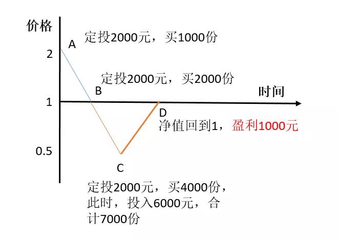 在这个举例中,当定投的基金净值再度回到“1”时,我们就盈利1000元了。