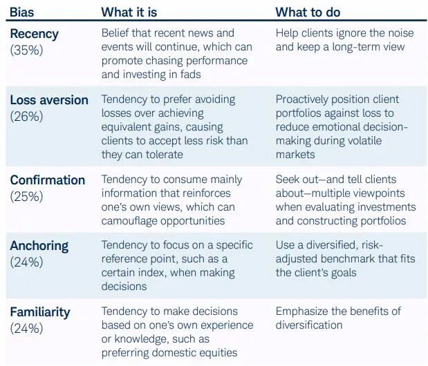 (国内券商表示按照资产对客户进行分类,并没有综合考虑到客户偏好与需求)虽然应用行为金融学不可能完全调整客户的偏差,但根据参与调研的投顾的从业经验,行为金融学在帮助客户实现长期目标时十分有效,投顾们也为调整投资者的偏差制定了相应的策略。例如,投顾表示近因偏差、损失厌恶、确认性偏差、锚定偏差和熟悉度偏差是影响客户投资决策最常见的5种偏差,与此对应,投顾采用的策略分别为帮助客户忽略噪音、保持长期的视角。主动跟踪客户的投资组合避免客户的损失厌恶,减少客户在市场波动中的情绪决策。在评估投资组合时提供更多的视角。使用符合客户目标与风险偏好的多元化基准,强调分散投资的好处。(图片来自BeFi Barometer 2019)随着行为金融学的价值越来越被投顾所认可,诸如嘉信这样的领先的财富管理机构也开始尝试把行为金融学应用到投顾的工作中,为投顾赋能。例如,嘉信推出了一个叫Biagnostics的解决方案,提供了一系列与行为金融学相关的教育资源,包括行为金融学相关的教案、主题报告、操作指南、投资者手册等,投顾一方面可以学习行为金融学的相关知识,深入了解投资者的行为偏差,一方面也可以把这些材料作为圆桌讨论、主题演讲、客户研讨会等场合的投教资源,帮助客户识别自己的行为偏差与投资偏好,促进与客户之间良性的沟通交流,增加客户的信任,从而更好地处理他们在不同生命周期出现的问题,为客户制定真正符合他们利益的投资策略,让客户更满意。其实现在已经有很多投顾小伙伴意识到了投资者的一些行为偏差,大家也意识到了研究投资者的行为,了解投资者不断变化的风险偏好的重要性。