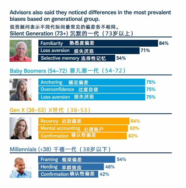 我们都说,财富管理要以客户为中心,了解不同客户的需求,为客户实现他们的财务目标提供合理的建议。但是,投顾如何才能真的懂自己的客户?如何才能帮助不同的客户优化投资决策?面对投资者不合理的诉求,不理性的投资观念,投顾该如何面对?这些可能都是投顾想解决但难以着手的地方。而行为金融学也许是投顾处理这些问题的一个好工具。实际上,国外一些领先的机构在向客户提供财富管理的服务中已经应用了行为金融学,行为金融学也得到了他们的认可。嘉信理财与投资与财富管理机构研究所,独立的市场研究与咨询公司Cerulli Associates就投资顾问对行为金融学的看法和应用进行了调研。调研显示,投顾十分热衷于行为金融学,70%的投顾表示在与客户沟通和交流时应用了行为金融学,58%的投顾表示在组合构建中应用了行为金融学。调研的投顾认为,应用行为金融学可以加强与客户的关系、增强信任,优化投资决策,更好地管理客户预期,减少客户的非理性决策,帮助客户实现更好的投资回报等。根据嘉信的调研,投顾们也积极地将行为金融学应用到了解客户,帮助客户优化投资等方面。例如,投顾们将行为金融学与人们的年龄阶段结合起来,研究了不同代际间的投资偏差的特点,结果显示,不同年龄段的投资者间存在的偏差各不相同。显而易见,应对这些客户的策略肯定也是不一样的。与国内粗略地按照资产对客户进行分类,这样会不会更有助于帮助投顾了解客户,帮助不同生命周期的客户调整行为偏差? (图片来自BeFi Barometer 2019)