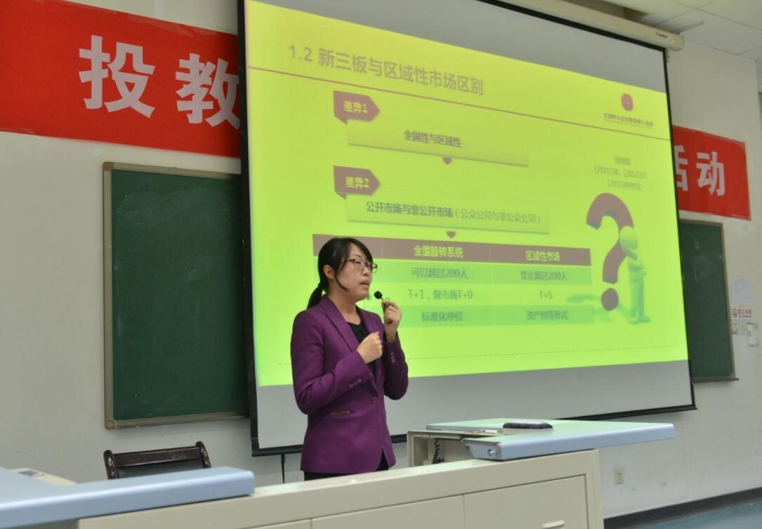“新三板是什么市场、新三板为实体经济带来什么?”来自全国股转公司投教基地的顾筝筝老师,用两个问题开始了自己的授课。顾老师的讲解通俗易懂,从新三板的服务对象、投资者结构、交易方式三个方面,全面介绍了新三板市场的情况以及其与沪深交易所、创业板的区别,帮助学生们在课本知识以外,重新认识了新三板在多层次资本市场中发挥的重要作用,对于丰富学生们的金融知识有着很大的提升。