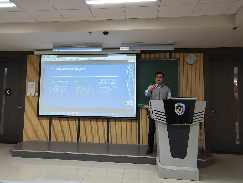 张大威老师讲课风趣幽默,深入浅出的为同学们讲解了证券行业的兴衰变化,潮起潮落。讲到零售、投行、资管、两融等具体证券业务时,同学们都听得聚精会神,从书本走进了实践。张大威老师还向同学们讲述了金融机构内具体岗位的特点和技能,包括风控、财务、清算、HR等等,让同学们对毕业后的就业有了更加清晰的认识,能有针对性的寻求最适合自己的公司和岗位。