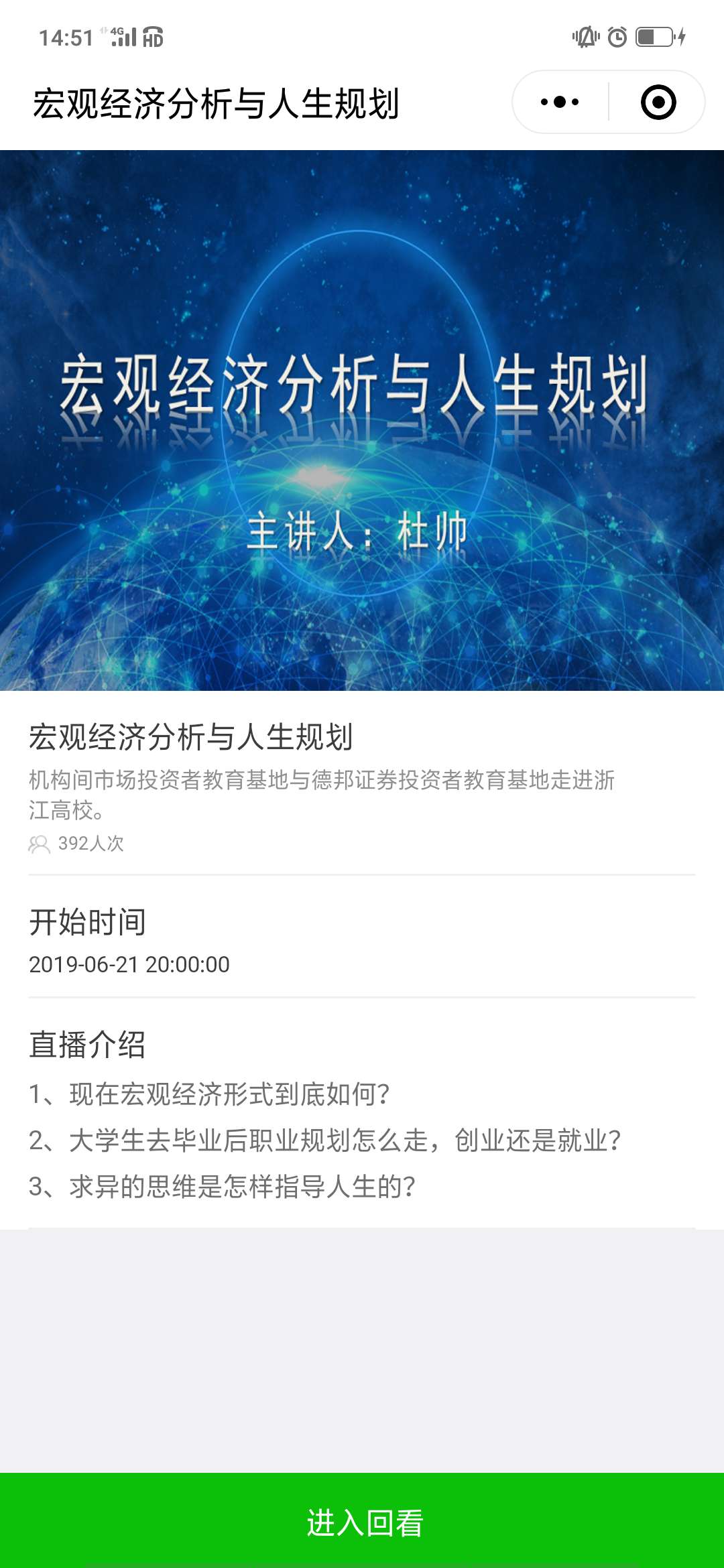 2019年6月21日晚8点,机构间市场投资者教育基地与德邦证券联合举办的第一期金融知识直播活动顺利开播,本次直播活动以“宏观经济形势分析与人生规划为主题”,特邀金融学家、知名投资人、青年企业家杜帅讲师为同学们进行讲授,并对江浙地区6个高校微信群进行实时直播,共392位同学参与了本次直播活动。