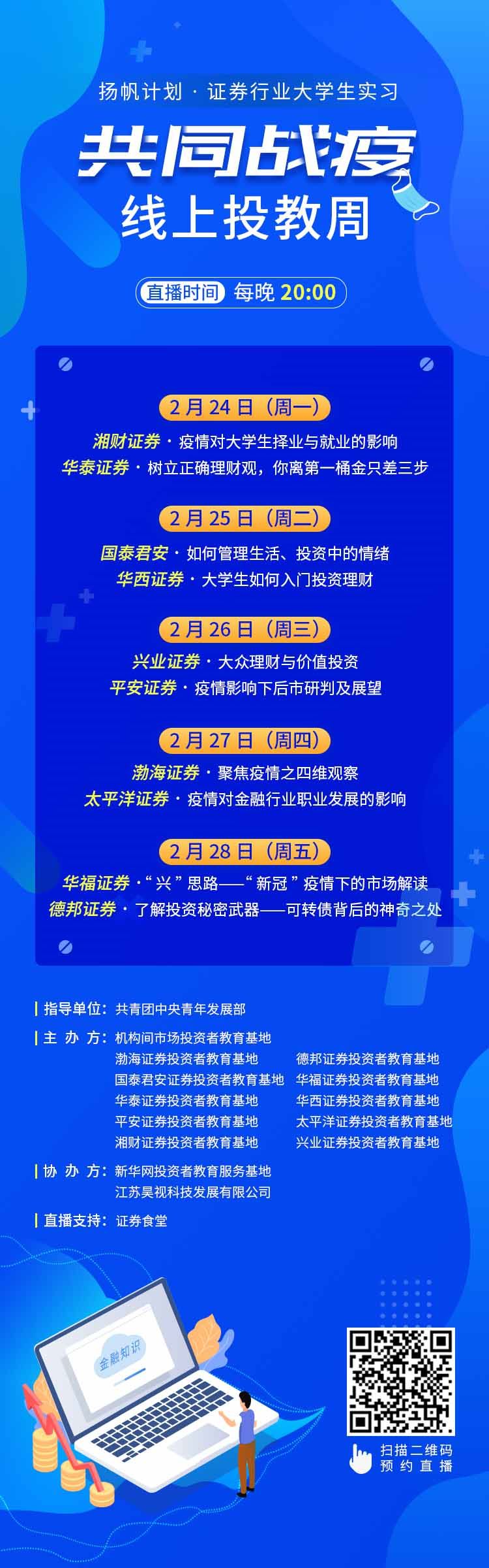 在共青团中央青年发展部的指导下,“扬帆计划·证券行业大学生实习”之“共同战疫线上投教周”活动将在2月24日正式开启(下周一)。在这里,你可以足不出户全方位学习证券金融知识,听行业大咖介绍金融行业职业发展规划。让我们在家的学习丰富起来吧,奥利给!!!